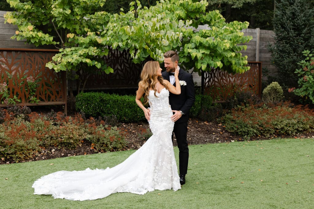 What makes this venue stand out is the balance between nature and modern design. Couples can celebrate surrounded by lush gardens, towering trees, and peaceful water features while also enjoying sleek architecture and dramatic glass walls. The property offers a complete wedding-day experience with ceremony, cocktail hour, and reception spaces all in one location, making it convenient for couples and guests alike.